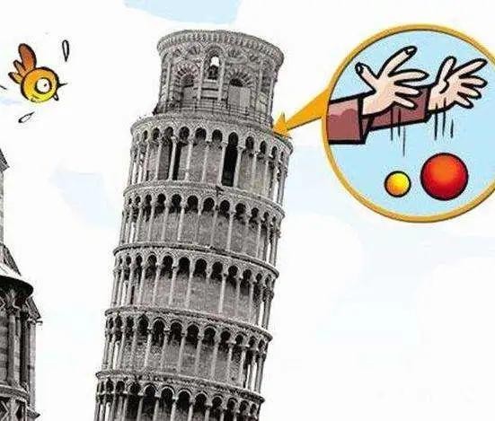 伽利略由此推断物体下落的速度应该不是由其重量决定的。他在书中设想,自由落体运动的速度是匀速变化的。为了证明这一观点,1589年的一天,比萨大学青年数学讲师,年方25岁的伽利略,同他的辩论对手及许多人一道来到比萨斜塔。伽利略登上塔顶,将一个重100磅和一个重一磅的铁球同时抛下。在众目睽睽之下,两个铁球出人意料地差不多是平行地一齐落到地上。面对这个无情的实验,在场观看的人个个目瞪口呆,不知所措。这就是被伽利略所证明的,如今已为人们所认识的自由落体定律。“比萨斜塔试验”作为自然科学实例,为实践是检验真理的唯一标准提供了一个生动的例证。