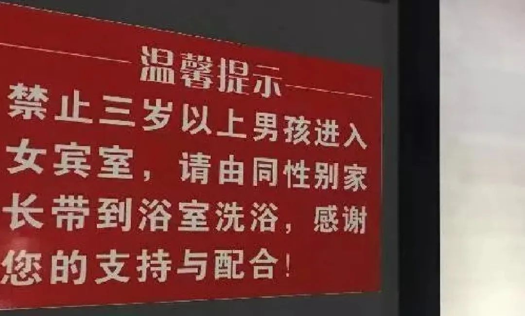 事实上,有很多女浴室都在门口放有醒目的标识:禁止三岁以上男孩进入女宾室,请由同性别家长带到浴室洗浴。