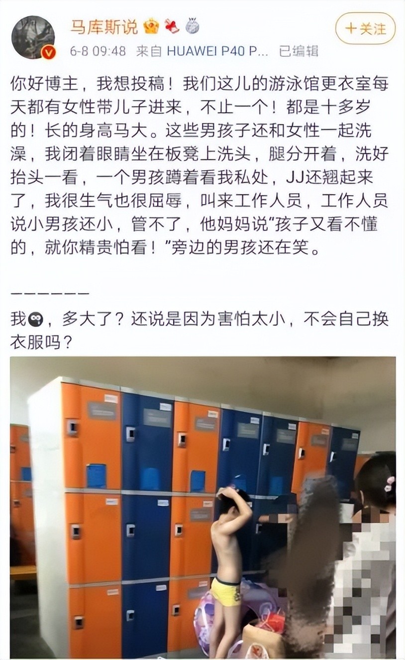 前段时间,有网友投稿称,当地游泳馆的更衣室每天都会有妈妈带着儿子进去。