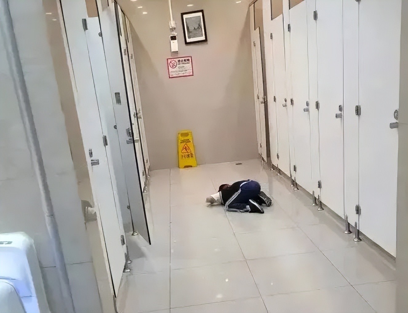 熊孩子趴在厕所的地下往隔间里面看,