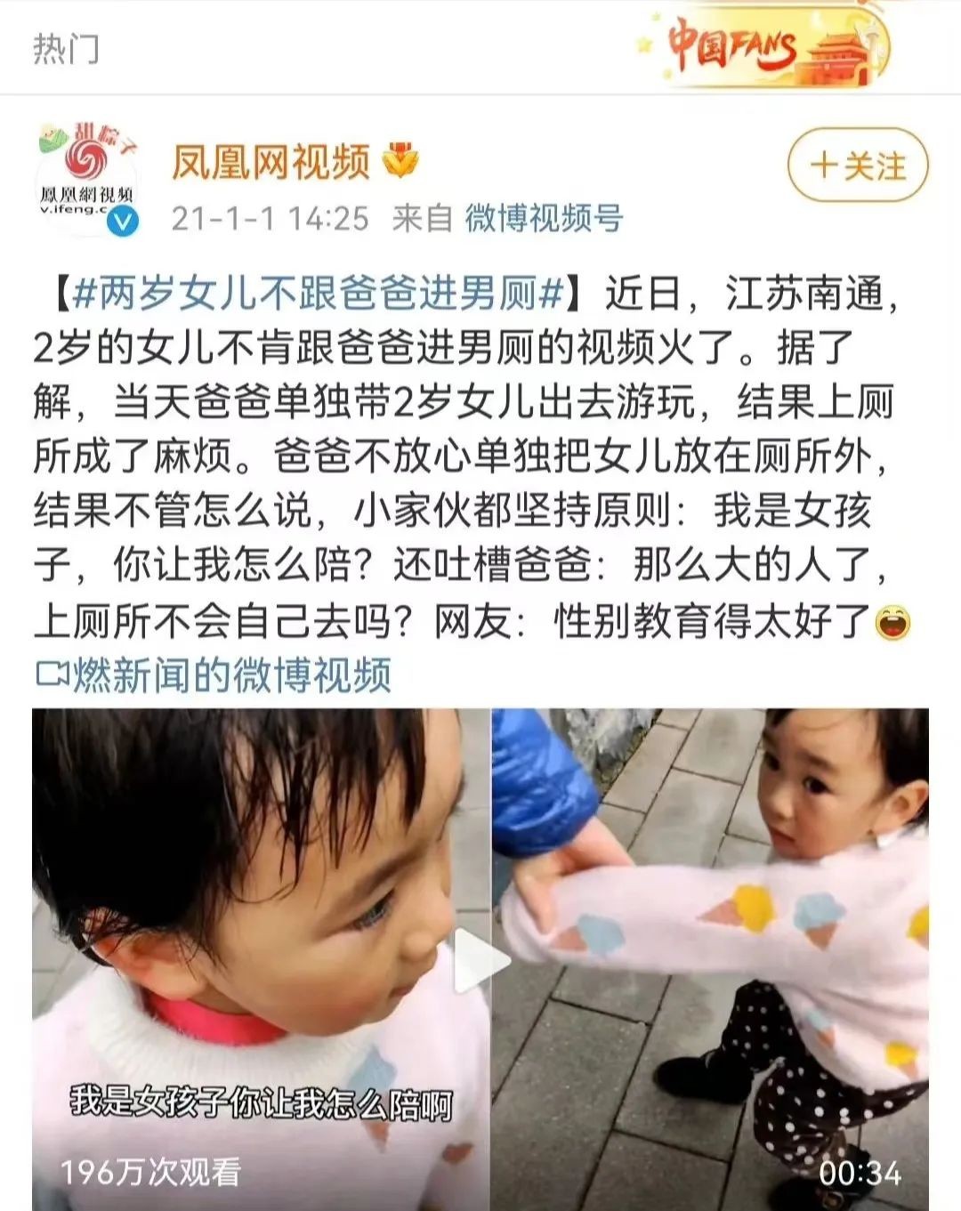 在江苏南通,一位爸爸带着2岁的女儿去上厕所时,女儿表现得十分抗拒,并对爸爸说:“我是女孩我怎么陪你上厕所呀?”
