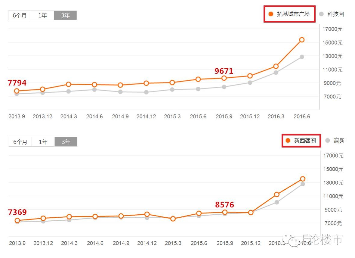 可以看到新西茗阁公寓从7369元升值到8576元,增值率为16.4%;拓基城市广场从7794元升值到9671元,增值了24.1%,比新西茗阁多了差不多近8个百分点,多了近一半收益。