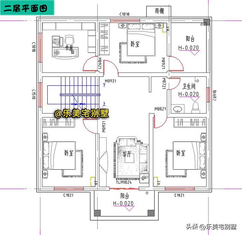 二 层: 客厅(带阳台)、主卧(带阳台、书房)、2次卧、卫生间