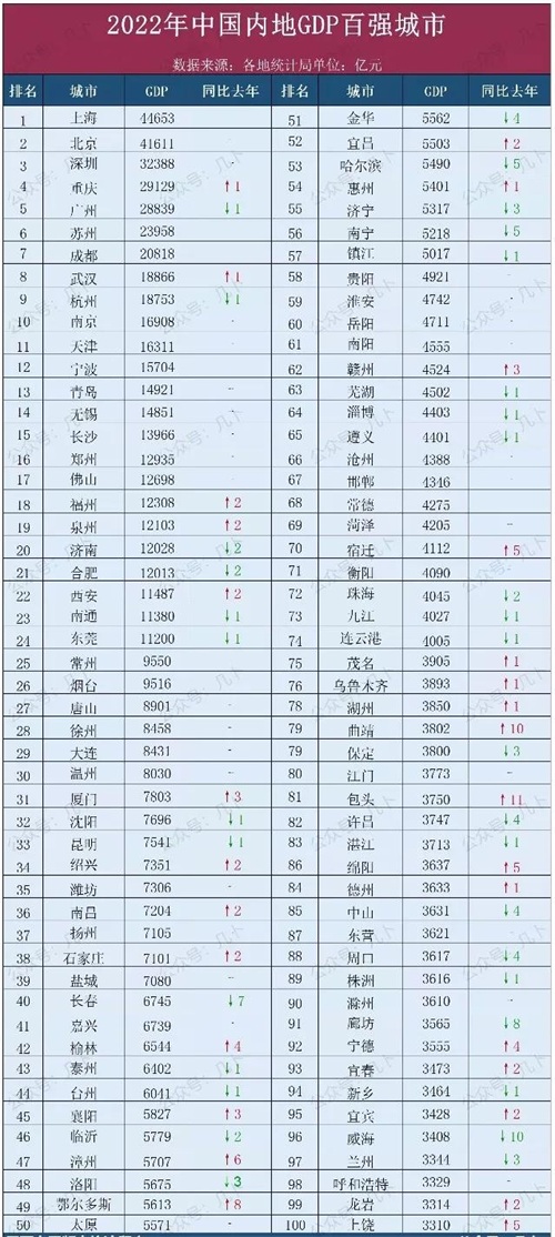 伴随着极不平凡的2022年,根据各地统计局公布的数据信息,百强城市名单新鲜出炉。下图是百强城市名单,通过名单我们会发现各省市经济发展状况。