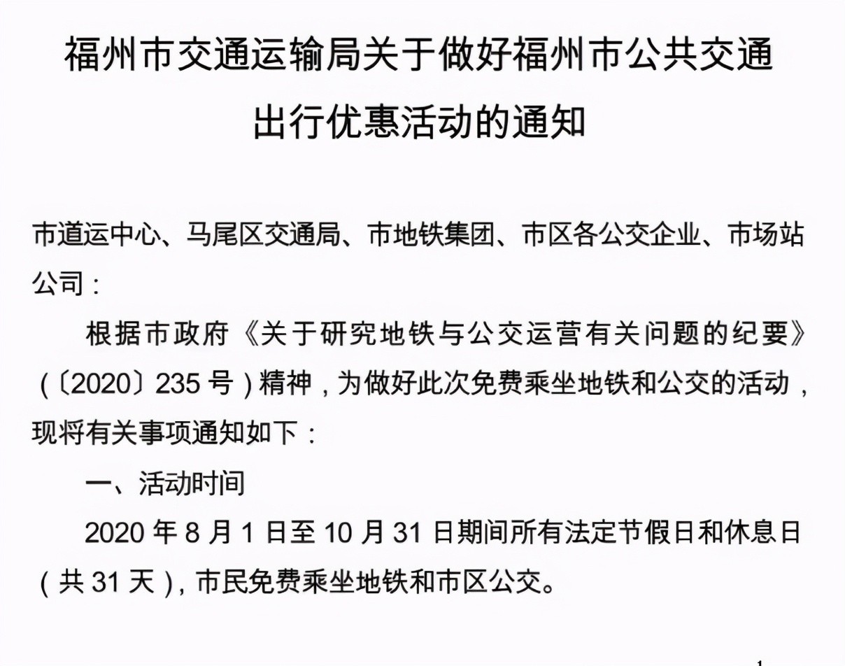 福州在2020年8月1日至10月31日的法定节假日和休息日(共31天)开展免费乘坐地铁和公交车活动。