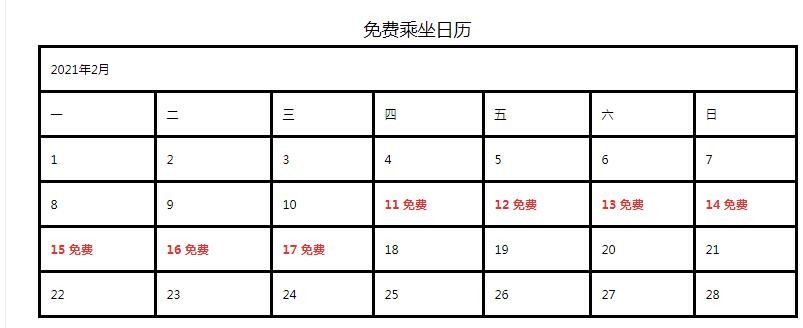 2021年2月11日至2月17日期间在法定节假日和休息日厦门公交集团在营常规公交、快速公交(不含定制公交)通通实行免费乘车措施。