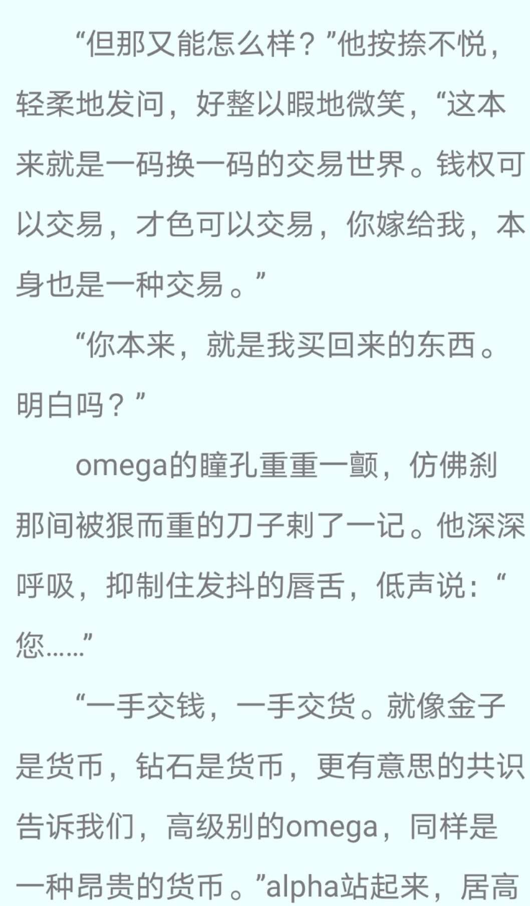 简单来说A是大家族的顶级Alpha,觉得应该结婚了就随便挑了一个小家族的O做了伴侣,尽管两人结婚了但是A并不爱O,只是把他当作花瓶宠物而已,甚至A很享受看着O被生理痛苦折磨的样子,小说中描述的是O万分痛苦,难受到在地上打滚,哀求A。
