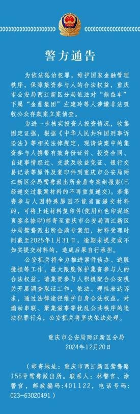 通告显示,为进一步核实投资人投资情况,收集固定证据,现请该案中的集资参与人携带有效身份证件、投资合同自述事情经过、交款及收益凭证、银行交易记录等原件及复印件到重庆市公安局两江新区分局鸳鸯派出所金鼎专案组报案。因特殊原因不能当面递交材料的,进行邮寄处理。材料受理时间截至2025年1月31日。
