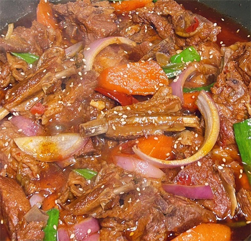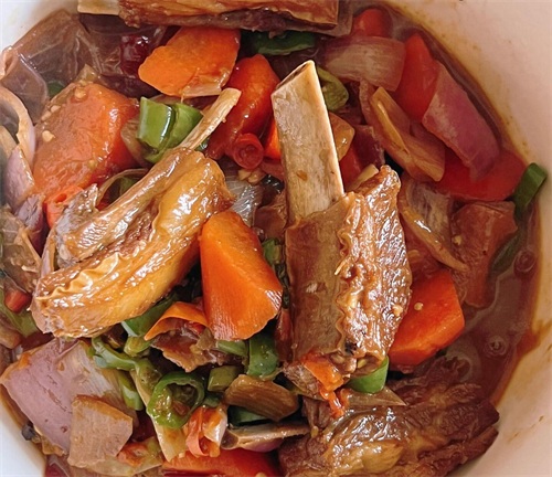 3、加入开水没过羊排,大火煮三分钟后转小火焖煮50分钟。然后放入胡萝卜再焖煮10分钟,直至胡萝卜煮软。最后加入洋葱和辣椒,少许老抽上色,翻炒收汁三分钟左右,即可出锅享用。