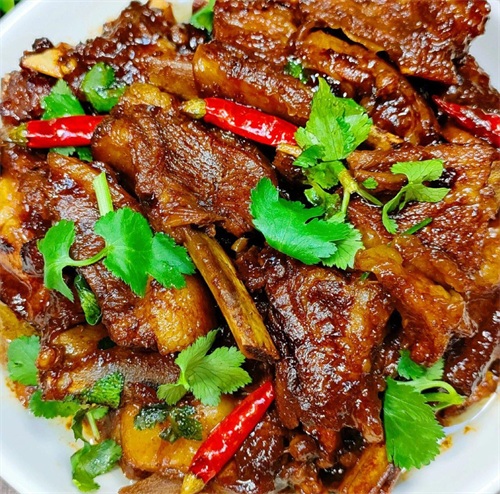 4、炖好后放入胡萝卜继续炖15分钟,使胡萝卜充分吸收汤汁的鲜美。最后放入少许鸡精翻炒均匀,大火收汁至汤汁浓稠,即可出锅装盘。