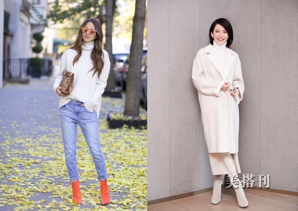 ♦在高领平纹白毛衣的穿搭中,日常推荐(上图一)的搭配,白色款毛衣+低腰浅灰蓝牛仔裤+橘色短靴,在穿搭上,低腰的款式毛衣前半塞,日常时髦简单的穿搭,整体白色穿搭(上图二),都以针织为主选。