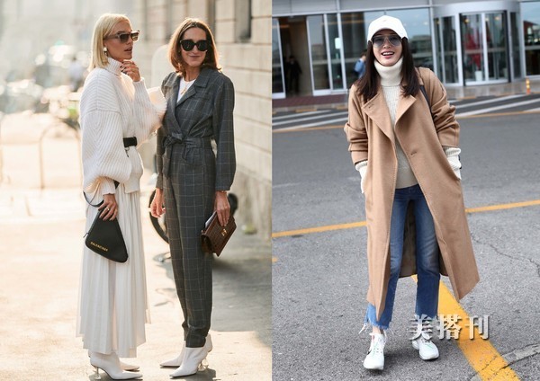 ♦日常中推荐借鉴的两款穿搭,整体白色穿搭,高领毛衣不可少,在选择毛衣的时候黑色腰带是推荐选择,一件腰带就能提升你的时尚度,如上图二中简单的穿搭,大衣的袖长短于白色毛衣,注意细节穿搭。