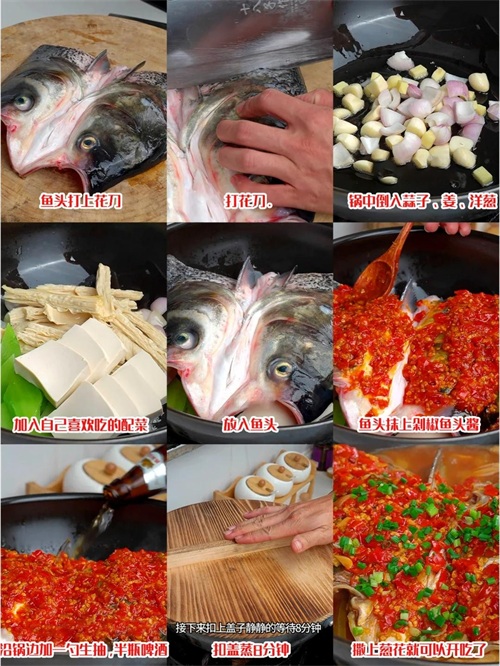 做法:1.鱼头打上花刀备用,锅中油热放蒜子、姜、洋葱炒出香味。2.放入自己喜欢吃的配菜,我这里放的是腐竹、莴笋、白豆腐。3.再放入鱼头,随后均匀的涂上饭匹兄弟的剁椒鱼头酱。4.沿锅边淋入半勺生抽和半瓶啤酒,扣盖8分钟。5.撒上葱花美味即成,鱼肉又嫩又入味。