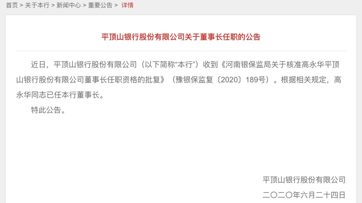 6月24日,平顶山银行官网披露公告显示,近日,平顶山银行收到《河南银保监局关于核准高永华平顶山银行股份有限公司董事长任职资格的批复》(豫银保监复〔2020〕189号)。根据相关规定,高永华已任本行董事长。