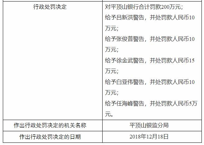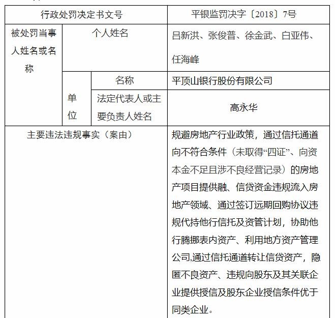 2019年1月10日,平顶山银行及5位高管收到了合计250万元的巨额罚单。原平顶山银监分局发布的行政处罚信息表显示,平顶山银行存在规避房地产行业政策,通过信托通道向不符合条件(未取得"四证"、向资本金不足且涉不良经营记录)的房地产项目提供融、信贷资金违规流入房地产领域、通过签订远期回购协议违规代持他行信托及资管计划,协助他行腾挪表内资产、利用地方资产管理公司,通过信托通道转让信贷资产,隐匿不良资产、违规向股东及其关联企业提供授信及股东企业授信条件优于同类企业等违法违规事实,原平顶山银监分局给予平顶山银行合计200万元人民币处罚;吕新洪、张俊普、徐金武、白亚伟、任海峰5位相关负责人分别被处以警告处分,并合计罚款50万元。可以看到,其中"张俊普"即此前2019年5月29日河南银保监局批复任职的平顶山银行副董事长。