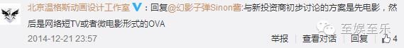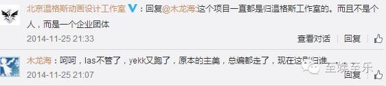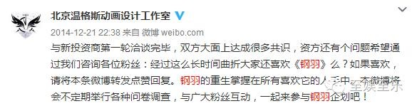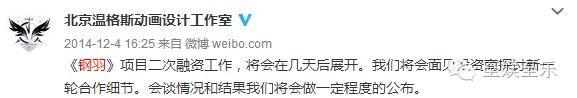 接着,三个月后(2014年11月),就冒出了一个叫“北京温格斯动画设计工作室”的官博,声称钢羽的消息以自己为准,并且钢羽动画化的项目归属于该工作室。