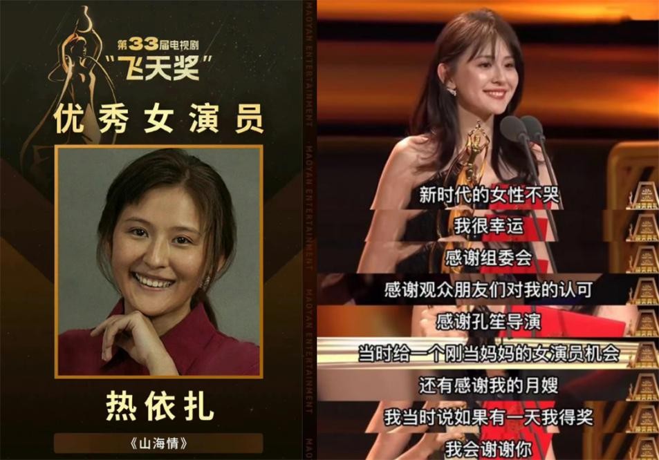 聚光灯闪耀,热依扎紧紧握着飞天奖奖杯,眼眶湿润,声音略带颤抖地表达感谢,特别提到了一位常常被忽略的人——她的月嫂。