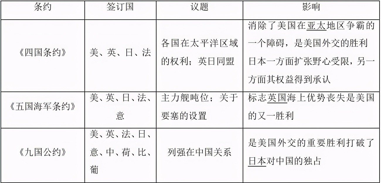 《五国海军条约》:该条约主要解决美英日三国在太平洋地区的军备竞赛,规定了美、英、日、法、意五国海军力量(吨位)比率为5:5:3:1.75:1.75。实际上中心就是美英日三国,法国、意大利海军忙着自己本土周边海域就差不多了,哪有功夫到太平洋来