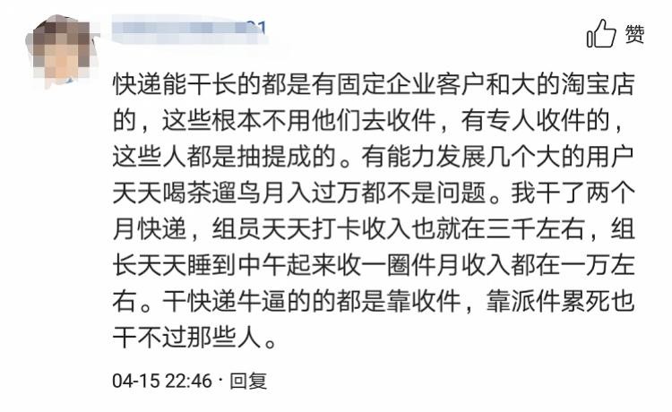 除此之外,还有有网友跟帖表示,在这一行人脉比体力重要得多,“快递能干长的都是有固定企业客户和大的淘宝店的,这些根本不用他们去收件,有专人收件的,这些人都是抽提成的。有能力发展几个大的用户天天喝茶遛鸟月入过万不是问题。我干了两个月快递,组员天天打卡收入也就在三千左右,组长天天睡到中午起来收一圈件月收入都在一万左右。干快递牛的都是靠收件,靠派件累死也干不过那些人。”