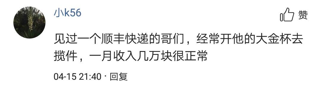 还有网友表示,“见过一个顺丰快递的哥们,经常开他的大金杯去揽件,一月收入几万块很正常。”