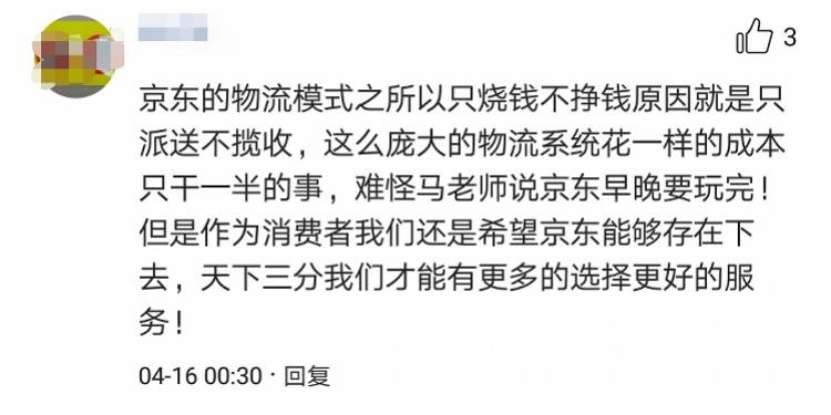 “京东的物流模式之所以只烧钱不挣钱的原因就是只派送不揽收,这么庞大的物流系统花一样的成本只干一半的事,难怪马老师说京东早晚要玩完!但是作为消费者我们还是希望京东能够存在下去,天下三分我们才能有更多的选择更好的服务!”这位网友的跟帖,或许是很多网友的共同心声。