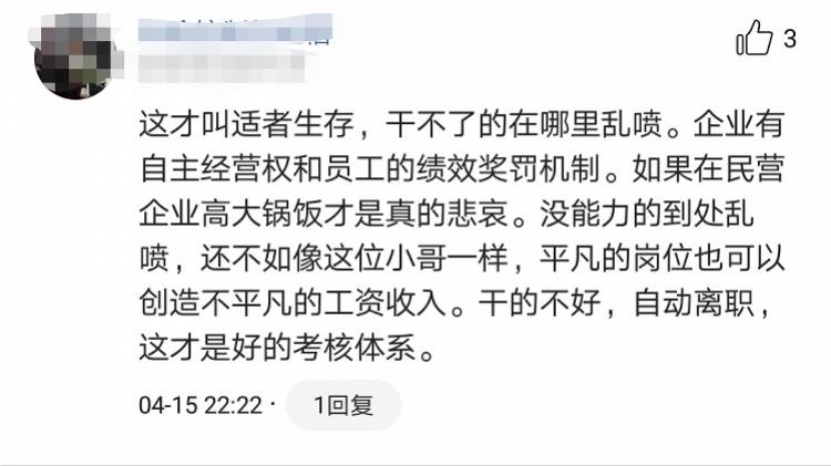 还有网友认为,“这才叫适者生存,干不了的在哪里乱喷。企业有自主经营权和员工的绩效奖发机制。如果在民营企业搞大锅饭才是真的悲哀。没能力的到处乱喷,还不如像这位小哥一样,平凡的岗位也可以创造不平凡的工资收入。干的不好,自动离职,这才是好的考核体系。”