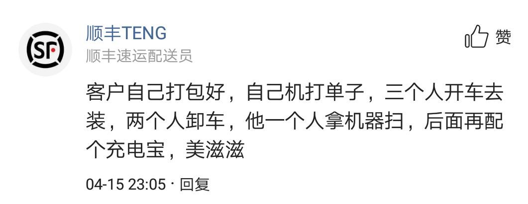 对此,连加V认证的顺丰速运配送员也留言科普,“客户自己打包好,自己机打单子,三个人开车去装,两个人卸车,他一个人拿机器扫,后面再配个充电宝,美滋滋。”