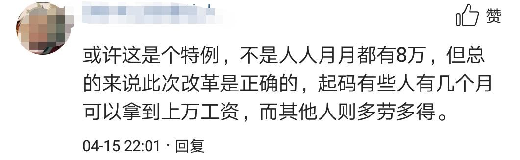 但也有网友表示,“或许这是个特例,不是人人月月都有8万,但总的来说此次改革是正确的,起码有些人有几个月可以拿到上万工资,而其他人则多劳多得。”