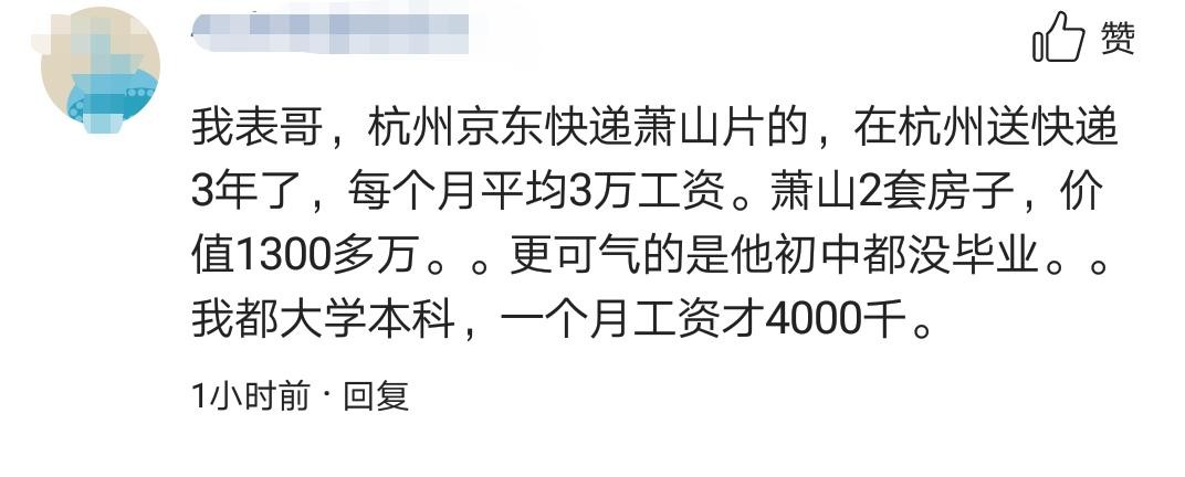 “我表哥,杭州京东快递萧山片的,在杭州送快递3年了,每个月平均3万工资。萧山2套房子,价值1300多万,更可气的是他初中都没毕业。我都大学本科,一个月工资才4000。”一位网友这样表示。