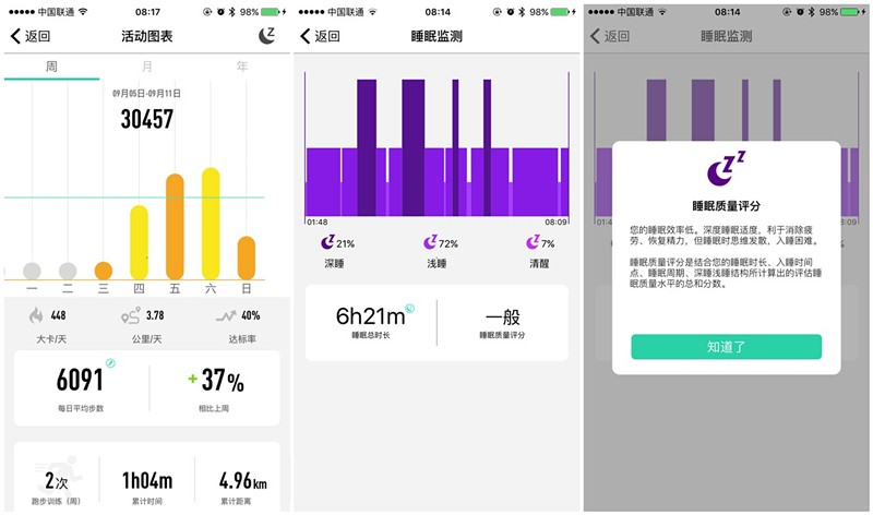 相比于其他品牌手机端数据的单一展示,唯乐已经开始在做内容,在运动、睡眠等数据页还可点击进入查看综合评价及建议。