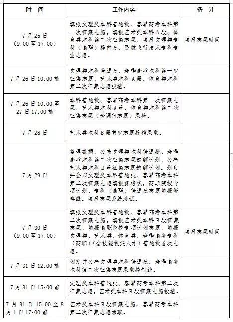 6、7月30日,填报文理类本科普通批、春季高考本科第二次征集志愿,填报艺术类本科B段征集志愿,填报高职院校专项计划、文理类、艺术类、体育类、春季高考专科(高职)普通批首次志惠。
