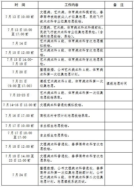 2、7月5-6日,填报自主招生批(含高校专项计划)志愿,填报文理类本科普通批(含地方农村专项计划)、艺术类本科批(含A段和B段)、体育类本科、春季高考本科首次志愿。