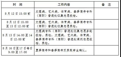 7、8月11日,填报文理类、艺术类、体育类、春季高考专科(高职)普通批征集志愿。