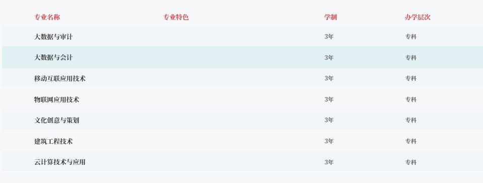 学校有58个本科专业,27个专科专业,100多个专业方向。其中,审计学(ACCA)为省内本科一批招生专业,有7个专业为省级一流本科专业建设点。学校获批了16个教育部1+X证书制度试点,包括3D引擎技术、工业机器人应用编程、建筑信息模型(BIM)等。学校还拥有1个省级课程思政示范中心、2个省级课程思政示范团队。