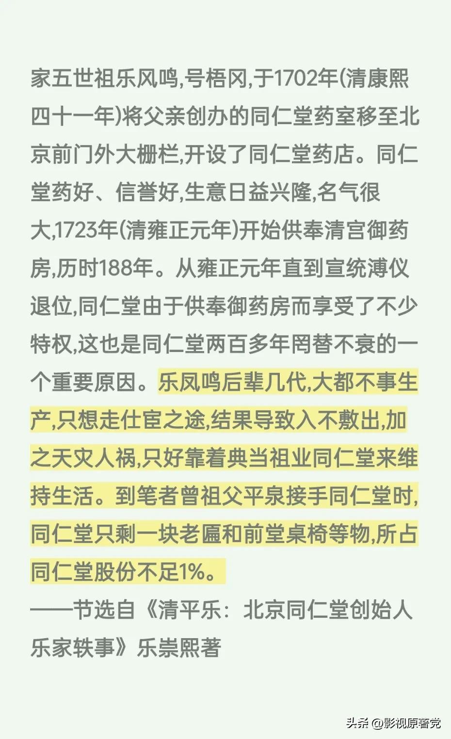 乐家起源于山西太原,历史上有名的乐羊子据说也是乐家先祖,而清朝康熙年间,乐家第四代子弟乐显扬和其子乐凤鸣在北京开设了同仁堂药店,凭着过硬的技术与钻营,很快就成了清朝皇室的御用药商,但雍正年间同仁堂被卷入了政治斗争,乐家人因为“抓错药”的罪名被判了死刑。。。和《大宅门》里白颖园被害“死”的情节类似。