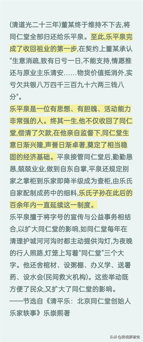 道光年间,乐家的十代子弟乐平泉虽然家境贫寒,却硬是凭借着过人的本事与毅力,几经周折费尽心思才终于把祖业同仁堂的全部股份收回乐家,乐平泉便被奉为乐家的中兴之祖,而这位乐平泉,便是《大宅门》里白萌堂的原型。