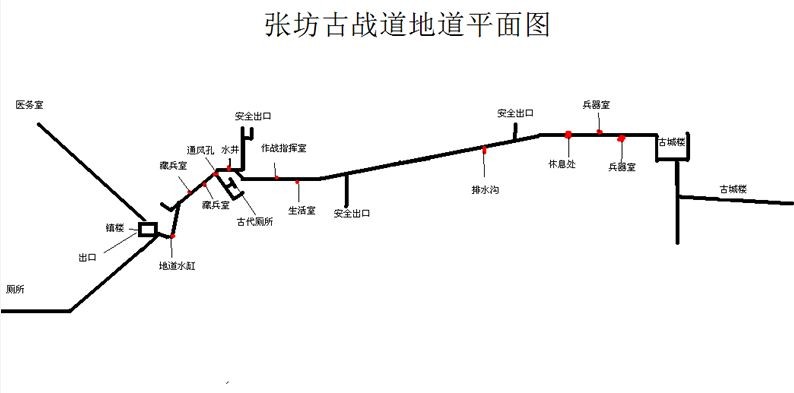 张坊古战道内有藏兵室、兵器室、指挥室和生活设施,对研究古代军事、政治、建筑有较高价值。战道从地面进深4米,青砖结构,顺砌,上下错缝,顶部为立砖顺砌。这种砌法与宋、辽时代营造法式一致。古战道宽2米,并排可列3人,高为2米3左右,下面青砖墁地,边侧设有流水槽、盛水缸,墙壁有台灯,顶部有通气孔,地道内有一深水井,地道两侧均有宽约2米的藏兵室,有的藏兵室内上有土坑。