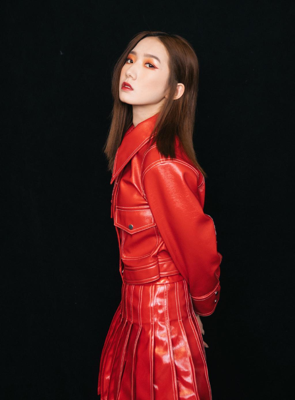 这次的红色皮衣孟美岐就非常大胆地配上了一身收腰短裙和一个夸张的橘色眼影,这种大面积的暖色调搭配可以说是十分张扬也需要本人有很强的气场才能hold得住。