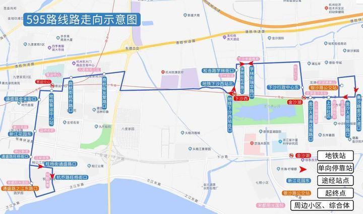 银沙路公交站始发,经银沙路、华景街、高沙路、金沙大道、海达南路、学林街、松合路、金沙大道、九沙大道、东湖南路、商杭街、杭乔路、九沙大道、通盛路、旺杨街、杭乔路、之江东路、通盛路至通盛路之江东路口;