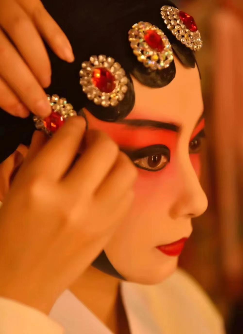俗称打粉底、拍彩,青衣扮相通常会用嫩肉色的油彩打底色,目的是纠正脸色。