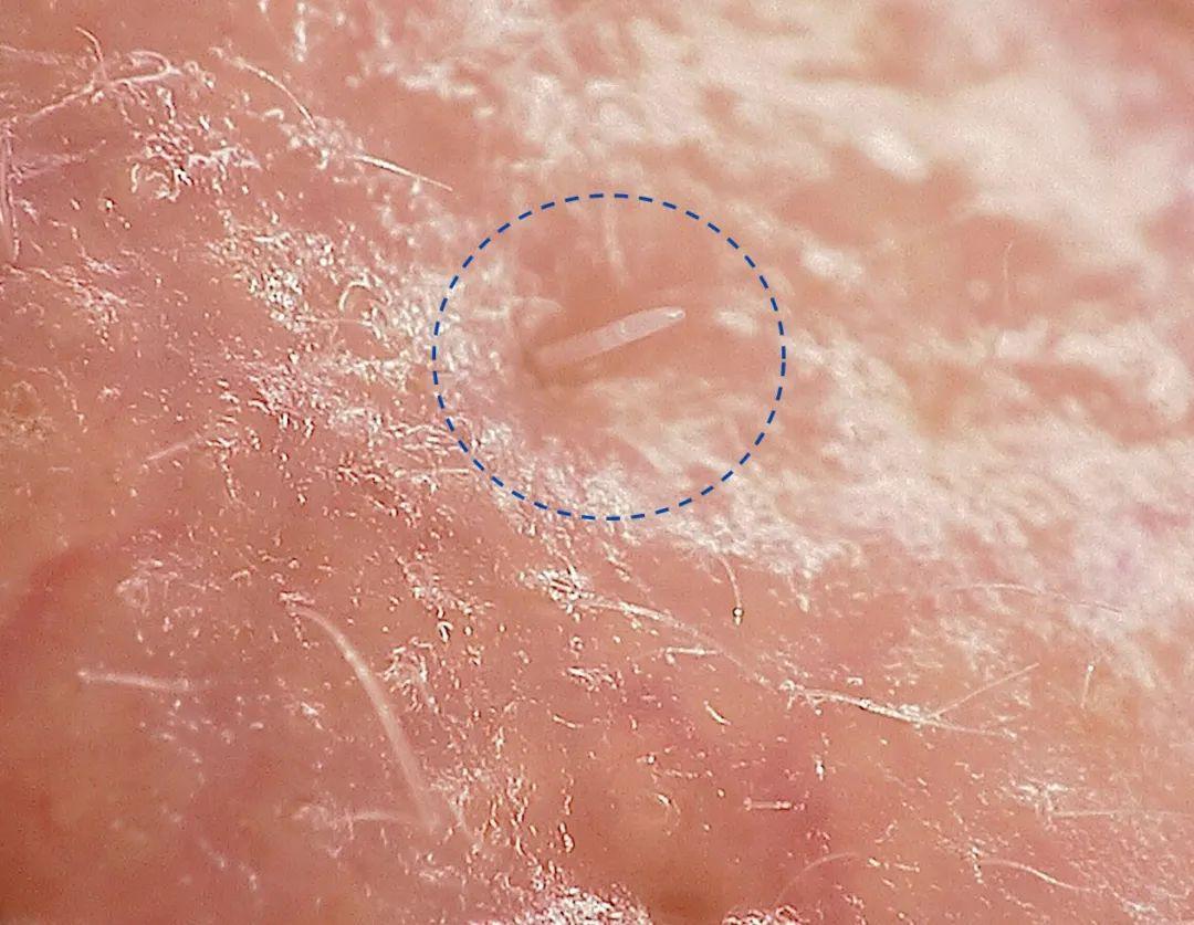 ▲箭头所指的是毛囊蠕形螨的肛门(图片来源:参考资料[2])
