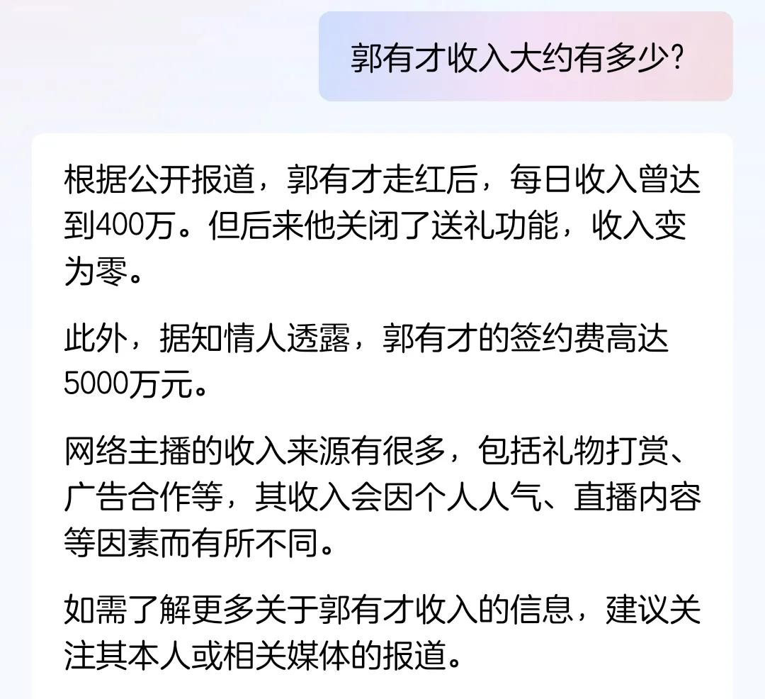 火了以后的郭有才一场直播围观人数达30万之多,音浪礼物收入最高一场个人税后达500万,有人预计郭有才一个月收入将超亿元。