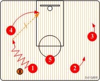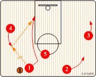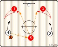 也可以由控球后卫(1)将球传给小前锋(3),然后从外侧切入到底角