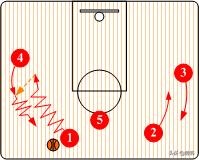 小前锋将球传入内线后,就移动到另一侧为大前锋(4)作掩护让他有机会摆脱防守队员。而这时控球后卫则可以寻找底线突破的后门。