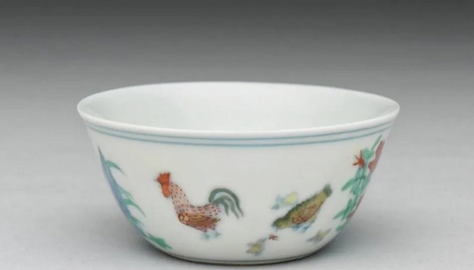 这种作品为什么称为鸡缸杯呢?先说鸡,它指的是杯子上的纹饰:一家公母老幼五只鸡,画面祥和,其乐融融。还有据学者猜测,成化元年为鸡年,鸡又与“吉”谐音,取吉祥之意。鸡又有五德“文武勇仁信,一鸣天下白”。再说缸,这指的是造型。