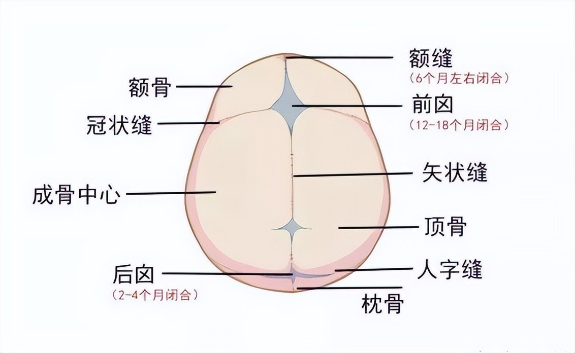 颅缝之间相交汇的区域就是囟门,前囟是额缝和两个冠状缝的交汇之处,后囟门是矢状缝和人字缝的交汇处。如果这些颅缝提前闭合了,就会局限大脑正常的发育,头颅形状也会发生改变,从而就会产生各种头颅畸形。