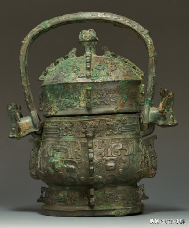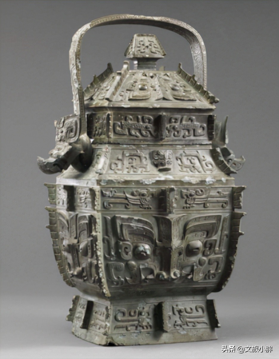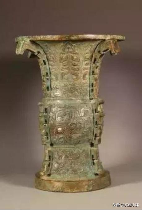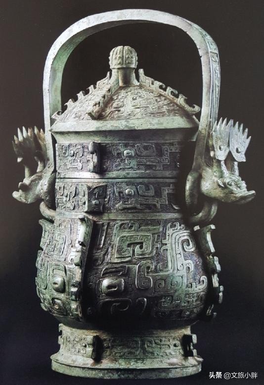 尊是一种盛酒的容器,盛行于商代和西周时期,到春秋、战国的时候就渐渐消失了,按照东汉许慎《说文解字》中的解释,尊是祭祀时接待宾客所用的礼器,用于表达主人的敬意。所以“尊”又有敬重、高贵的意思。“尊重”、“尊敬”等也就变成了对人的一种敬重之词。这件商代晚期铜尊,大口外侈,中部圆鼓,下接喇叭形圈足,肩部和腹部装饰有兽面纹等花纹,肩部等距离排列三个浮雕的牛首。这件铜尊据称20世纪20年代出土于河南某地,不久即被销往欧洲,2000年保利艺术博物馆将其抢救回国,现藏于北京保利艺术博物馆。此尊形体较大,造型十分规整,展现出很高的铸造工艺水平,一直被欧洲的青铜器学者视作公元前14世纪前后中国青铜艺术的代表作之一。