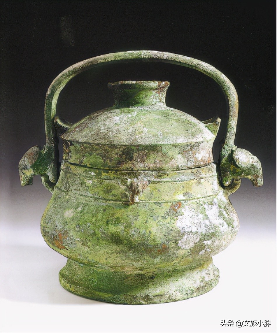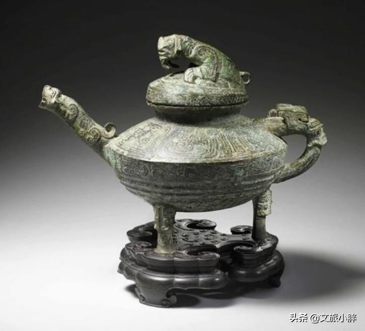 商周贵族行“沃盥之礼”,也就是洗手,需要用盉从上向下浇水洗手,洗手水落入盘中;盉与盘相配构成一整套行“沃盥之礼”所必需的重要器皿。这件西周晚期铜盉的装饰十分复杂而精彩,盖纽为一只大型凤鸟,双翅上翘。凤鸟身上又有一只勾喙的小鸟,被一只回首卷尾的虎抓住,虎前后腿回环成为穿孔,通过穿钉使器盖与下方的把手相连接,上下扭运灵活,设计十分巧妙。中国保利集团公司从海外回购,现藏于北京保利艺术博物馆。此盉为极少见的扁盉,通高44.5厘米,为目前所见形体最大的古代青铜盉之一,而且工艺复杂,设计巧妙,具有很高的历史与艺术价值。