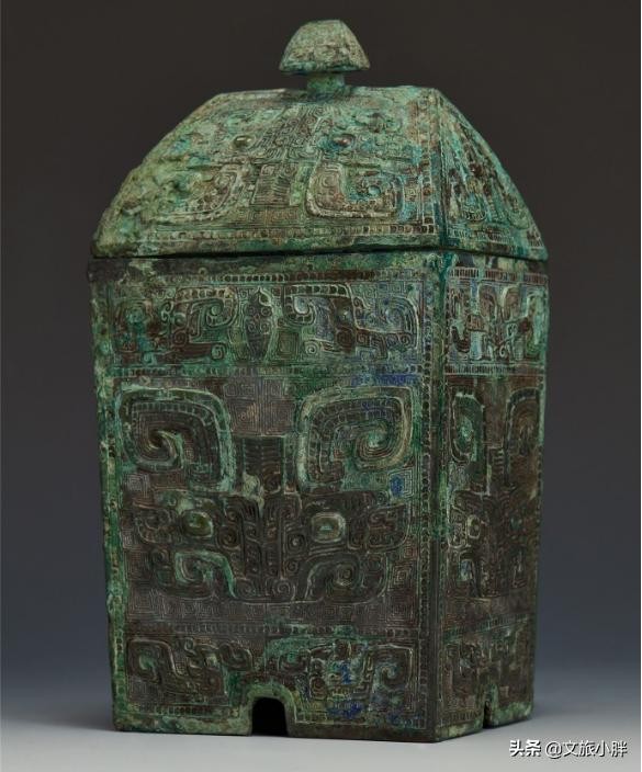 方彝是仿照宫室外形制造的屋形礼器,平面呈长方形,上有四阿顶盖,中为斗形器身,下接方形圈足。青铜方彝自商代晚期出现,至西周中期时便逐渐消失,存世数量极少。此方彝通高18.2厘米,器盖和器身均以兽面纹为主纹,下衬云雷纹地,器身兽面纹上下还装饰有龙纹、蝉纹等纹样,器盖与器身内壁有一字铭文“先”,标明它是商代“先族”的遗物。先族为商代大族,活跃在以山西浮山为中心的晋西南地区。中国保利集团公司从海外回购,现藏于北京保利艺术博物馆。此方彝直壁,外无扉棱装饰,装饰十分讲究,体量不大但工艺极精,宛如一座殿堂,凝耸华丽独具特色,如此造型存世仅三四件而已,更属罕见。