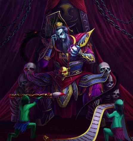 阎罗王,亦称“阎王”、“阎罗”、“阎王爷”、“阎魔王”、“阎罗大王”,为阴曹地府中第五殿的殿主冥王,是中国古代宗教神话信仰中的一尊阴间神祇,传说为掌管人间地狱众生灵寿命生死的鬼王,半神半鬼,为民间家喻户晓的著名冥神,在阴间常以“黑白无常”、“牛头马面”两对鬼使差为左膀右臂。《问地狱经》的记载称阎罗王生前是毗沙国的国王(民间传说为包拯)